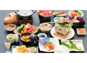 和牛のミニステーキとヤマメの塩焼き、季節を感じる野菜の天ぷら、大分名物とり天、かしわご飯など、自慢の品々を一度にお楽しみいただける会席料理をご賞味ください。